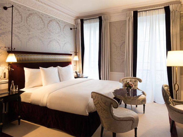 Le raffinement du Paris de la Belle Epoque se dévoile avec talent dans cette chambre de 45 m² avec vue sur le patio verdoyant. Teintes pastel ou plus soutenues, parquet en point de Hongrie, tissus de Damas chatoyants, l’atmosphère est lumineuse et se module le soir venu selon les désirs grâce à la tablette interactive. La salle de bains, spacieuse, tout en marbre de Carrare, dispose d’une double vasque, d’une baignoire ainsi que d’une douche à l’italienne.