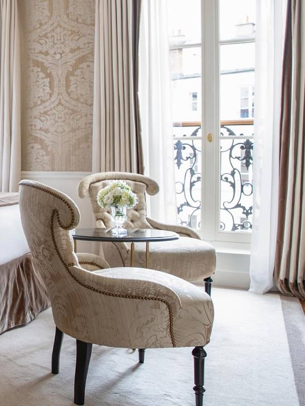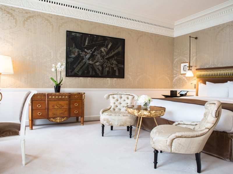 Le chic parisien du XIXe siècle s’exprime avec raffinement dans cette chambre de 40 m² avec vue sur le patio verdoyant. Parquet de Hongrie, tissus de Damas, teintes pastel ou plus soutenues, l’ambiance se fait douce et se module au gré des envies grâce à la tablette interactive à disposition.