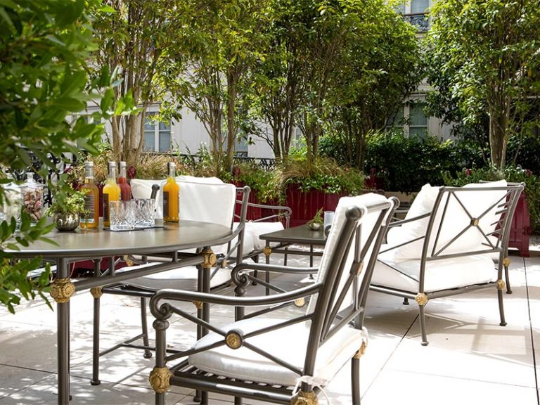 Elle offre aussi de vastes volumes et une surface généreuse de 50 m2, un mix parfait entre le confort et l’élégance. Mais cette suite a quelque chose en plus… La merveilleuse terrasse privée de cette suite, avec vue sur le patio à la française, rend cette suite vraiment unique. Ultime privilège en plein Paris ! Une cachette secrète débordante de verdure, bien à l’abri des regards, grâce aux haies judicieusement aménagées. L’endroit idéal pour prendre le petit-déjeuner en été ou savourer le plaisir d’une coupe de champagne en tête-à-tête, confortablement installés dans les fauteuils, en surplomb d’une magnifique cour intérieure parisienne à l’architecture classée.