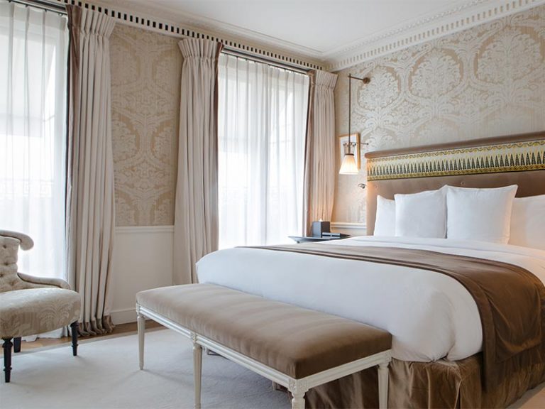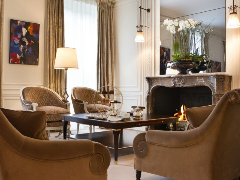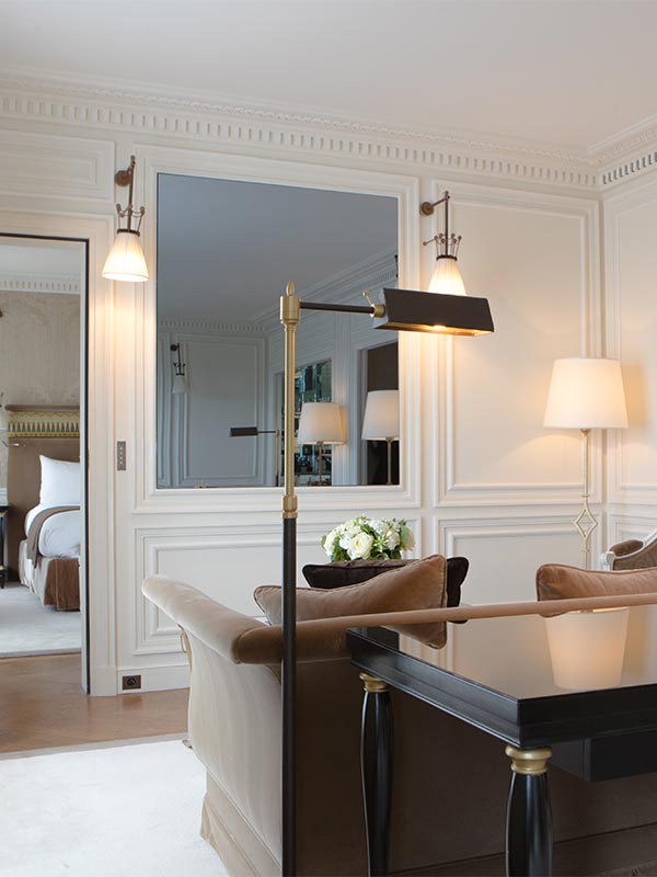 Premier atout, elles donnent sur l’avenue Gabriel et sur les vues que tous les amoureux de Paris connaissent par cœur : la Tour Eiffel qui domine son monde, le Grand Palais qui joue à cache-cache avec les frondaisons… Le joli balcon à la balustrade sculptée permet de se délecter du panorama à chaque heure du jour et de la nuit, lorsque la ville Lumière brille à l’infini. A la belle saison, on peut aussi savourer de cet observatoire privilégié un inoubliable petit déjeuner en ayant la sensation que Paris vous appartient. Les vastes espaces intérieurs rendent hommage au meilleur des arts décoratifs français, meubles de style napoléonien tout en bois sombre souligné d’or, canapés de velours cosy, objets d’art chinés chez les meilleurs antiquaires parisiens… Toute une atmosphère chargée d’histoire pour pouvoir écrire votre séjour féerique.