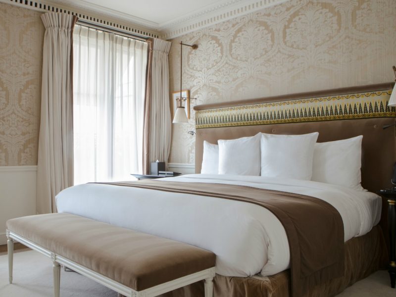 Even though the Marigny theatre is very close by, the real show is here: each suite is an amazing stage where Parisian life is played out in a perpetually elegant manner. The opulent velvet clothing the interiors may be interpreted as a nod to the classic decor of the capital’s great cultural venues. From the upper floors, referred to in theatre jargon as “paradise”, you enjoy a perfect vantage point from which to appreciate the repertoire of the finest Parisian landmarks: the Eiffel Tower, the Grand Palais glass roof, the spires of Notre-Dame in the distance… A legendary view to be admired from every angle afforded by the various windows and balconies dotted along the façade. The floor below houses a library filled with leather-bound tomes and a Louis XV desk, inherited from centuries of refinement and culture. Paris playing its finest role and its greatest performance.